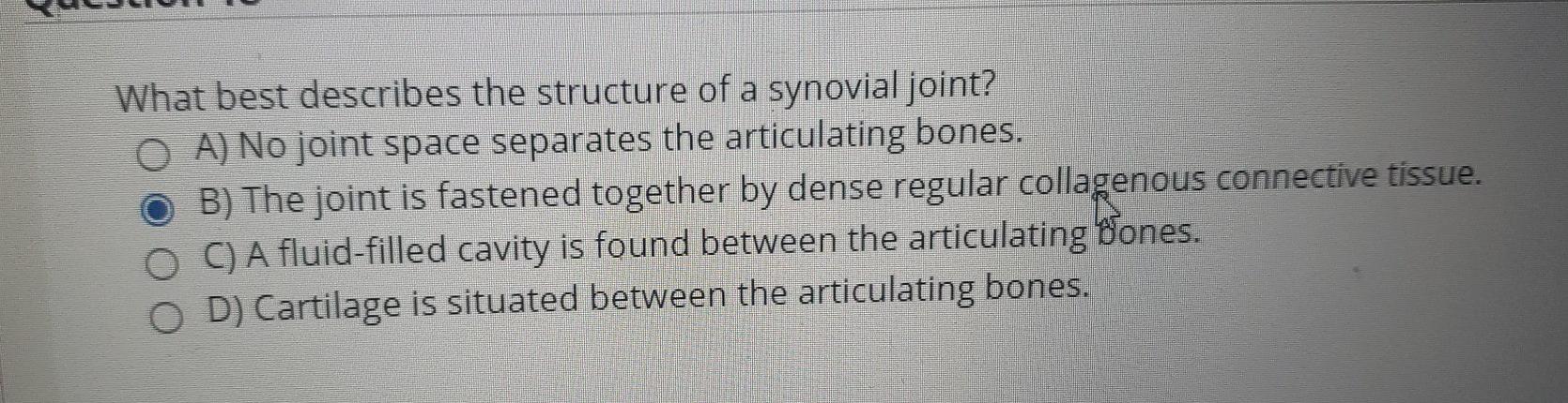 What best describes the structure of a synovial joint. Which statement best describes a bursa. Dense regular connective tissue has dark staining collagen fibers.