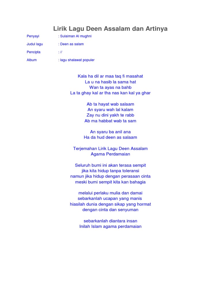 Sekian informasi mengenai lirik lagu Deen Assalam lengkap dengan teks arab dan terjemahannya semoga dapat bermanfaat. Lirik dan terjemah deen assalam Arti lirik Deen Assalam-- Lirik Lagu. Jadi dialah orang yang pertama kali mempopulerkan lagu ini.