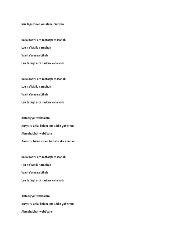 . Sebarkanlah ucapan yang manis hiasilah dunia dengan sikap hormat. Terjemahan Lagu Deen Assalam - Sabyan Lirik Lagu Deen Assalam tidak asing lagi di telinga kita sebagai Penikmat Musik Lagu ini menceritakan tentang Agama Islam adalah Agama perdamaian. Lagu ini pembawaannya sangat.